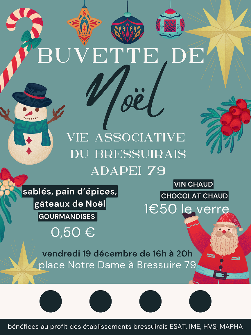 La vie associative du bressuirais ADAPEI 79 tiendra une buvette de Noël, sur la Place Notre-Dame à Bressuire.