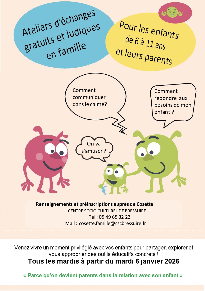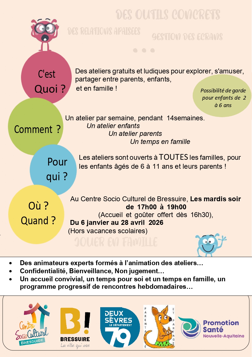 Les ateliers auront lieux à partir du 6 janvier jusqu’au 28 avril 2026, les mardis soirs de 17h à 19h au CSC de Bressuire.