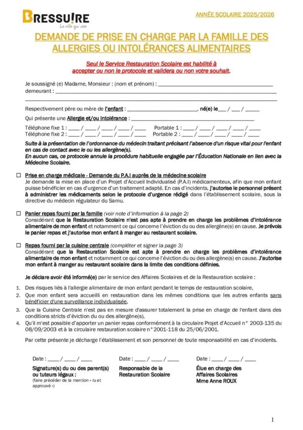 Une attention particulière est portée aux allergies et intolérances alimentaires. En cas de besoin, la constitution d’un dossier médical soumis au médecin scolaire est obligatoire. Il établira, dans l’intérêt et la sécurité de l’enfant, un protocole accueil individualisé (PAI) en collaboration avec le gestionnaire des restaurants scolaires de la Ville qui déterminera les modalités d’accueil en restauration.